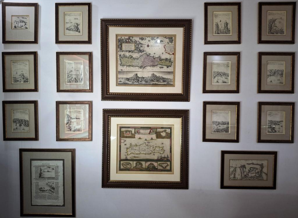 Στο κέντρο της συλλογής δεσπόζουν μια χρωματισμένη χαλκογραφία του Ολλανδού χαρτογράφου Frederik De Wit (1634-1706), Η Νήσος Κρήτη και οι οχυρώσεις της “Insula Candia ejusque fortification” από το βιβλίο De Wit, Frederik, Atlas sive descriptio terrarum orbis, Άμστερνταμ, π. 1680 και μια χαλκογραφία του Γερμανού χαρτογράφου Matthäus Seutter (1678-1757), Το νησί της Κρήτης χωρισμένo σε τέσσερα μέρη και άποψη του Ηρακλείου “Candia” από το βιβλίο Seutter, Matthäus, Atlas novus, sive Tabula Geographicae Totius Orbis, Άουγκσμπουργκ, μετά το 1744. Οι χάρτες μεγάλων διαστάσεων ολοκληρώνονται με τη χαλκογραφία του Φλαμανδού χαρτογράφου και γεωγράφου Abraham Ortelius (1527-1598), Η Κρήτη, το νησί του μεγάλου Δία, βρίσκεται στο μέσο της θάλασσας “Creta, Iovis magni medio jacet insula ponto” από το βιβλίο Ortelius, Abraham, Theatrum Orbis Terrarum, Αμβέρσα, 1584 και μια ανεξάρτητη χαλκογραφία του Henri Scheurleer, Turkey in Greece “Turquie en Europe”.