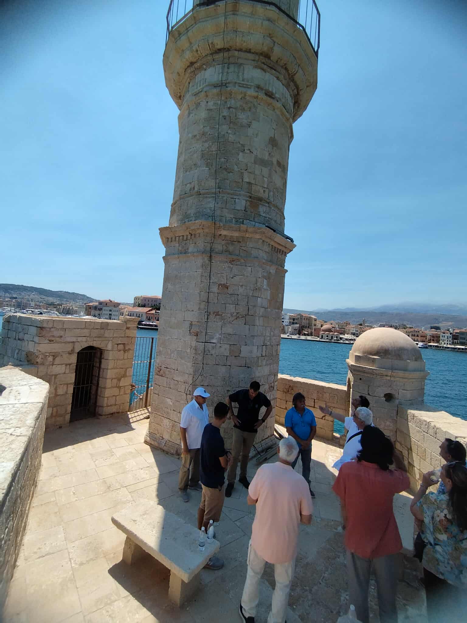 The visit continued with a guided walking tour along the breakwater of the Venetian Harbour of Chania, with an intermediate stop at the Chapel of Saint Nicholas of the Mole, and final destination the lighthouse, where participants had the opportunity to visit its interior. During the tour, information was provided on the operation of lighthouses, accompanied by a brief historical overview of the Venetian period in Chania.